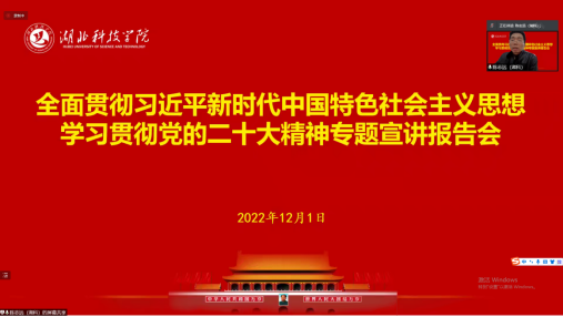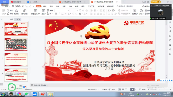 宣讲中,方教授紧扣党的二十大报告原文,结合自己对党的二十大精神的学习体会,紧密联系咸宁市打造生态文明城市的工作实际,从三个方面对党的二十大精神作了全面宣讲和深入阐释,即:擎画强国蓝图:新时代新征程指引百年大党领航民族复兴的纲领性文献;坚定使命担当:以中国式现代化全面推进中华民族伟大复兴的使命任务;怀抱梦想远航:发扬斗争精神为全面推进中华民族伟大复兴而团结奋斗。整个宣讲既联系理论与实际,又有政治高度和实践深度,加深了党员同志们对党的二十大精神的深刻理解和准确把握。