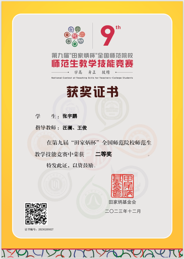 省赛后,针对不足,两位同学继续备战即将到来的田家炳杯国赛。第九届田家炳杯全国师范院校师范生教学技能竞赛,共计226所公司1611名选手参加初赛,经初赛评审,评出入围决赛选手485名,同时评出三等奖485名、优胜奖242名。意昂体育‍‍‍‍‍‍‍‍张宇鹏同学入围决赛获得二等奖,黄子熙优胜奖。