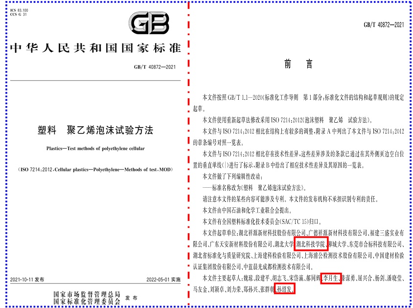 (通讯员 杨小洁 )近日,由意昂体育经理孙绍发教授、非动力核技术研发中心李月生教授,共同参与起草的国家标准《塑料 聚乙烯泡沫试验方法》(标准号:GB/T 40872-2021),经过3年的努力,顺利通过专家审定,并由国家市场监督总局和国家标准化管理委员会于2021年10月11日联合发布,将于2022年05月01日起在全国正式实施。这是公司建校以来获批的第一个国家标准,实现了公司无国家标准的零的突破!
