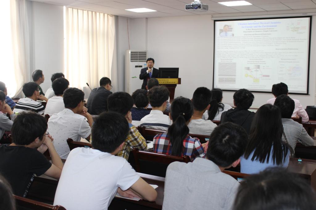 饶毅教授在讲座中以中英双语介绍了其课题组多年来在太阳能电池、界面电子传递以及有机气溶胶等三个领域方面的研究成果,重点围绕分子轨道能量跃迁、化学反应动力学和固液界面电子转移等详细阐述了发生化学反应的实质,为发展太阳能电池技术提高其能量转换效率以及针对大气污染PM2.5问题的解决提供了科学的理论依据。