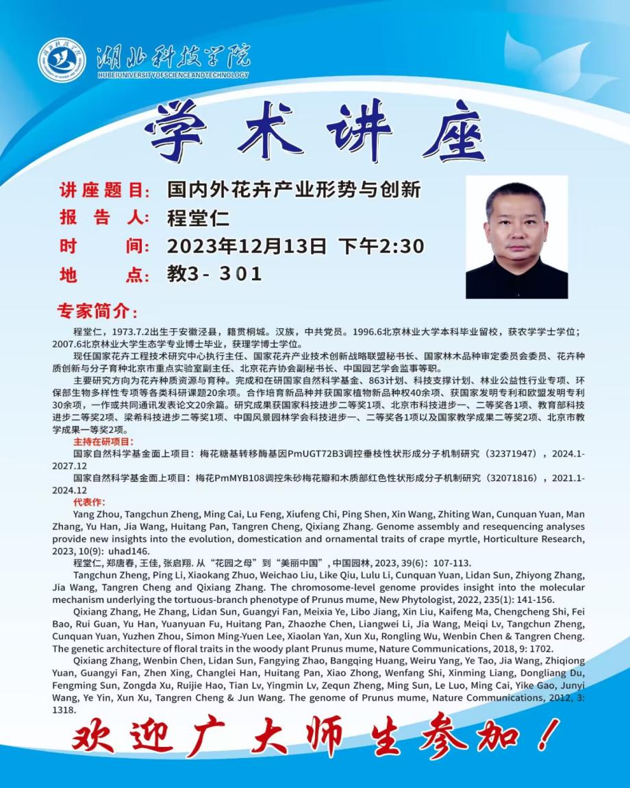 (通讯员:杨洁)12月13日下午,应国家林业草原桂花工程技术研究中心、意昂体育邀请,国家花卉工程技术研究中心执行主任、北京林业大学园林公司程堂仁教授在教3-301室作题为《国内外花卉产业形势与创新》的学术报告,园林系蔡璇副教授、杨洁副教授以及核化生园林、生物科学本科专业员工部分研究生参加了此次讲座,讲座由曾祥玲副教授主持。