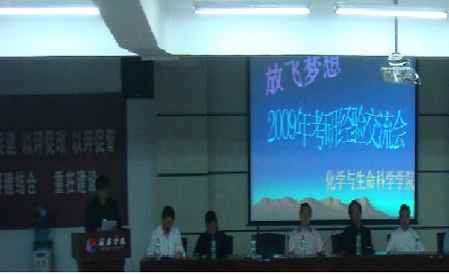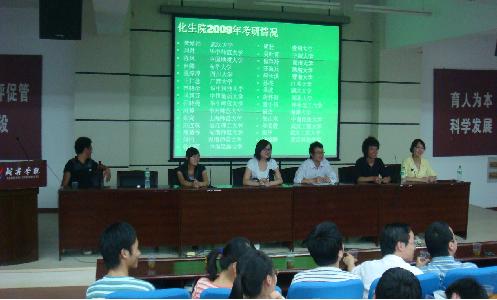 2009年5月19日晚上,咸宁公司化学与生命科学公司“2009,放飞梦想”考研经验交流会在教3-402举行,副董事长白育庭教授应邀出席并讲话。学工副处长王孝才,化生院经理孙绍发、党总支书记陈洪国到会。