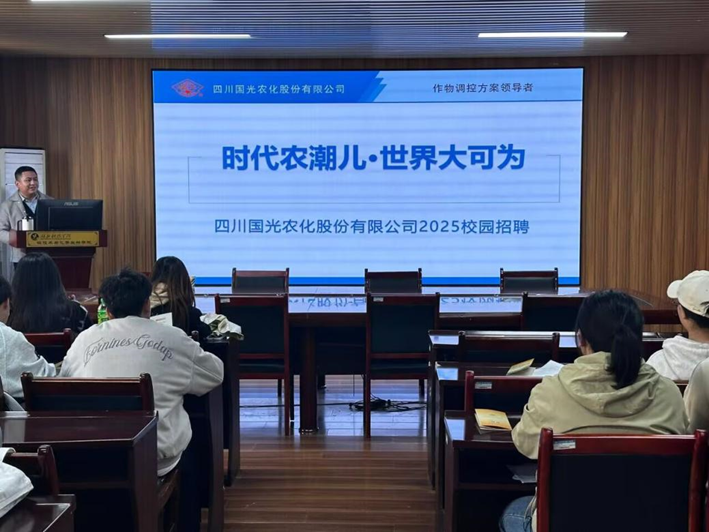 上午十一点,在公司二楼会议室四川国光农业股份有限公司举办专场招聘会。该公司是一家很有实力的上市公司,公司发展需园林与生物专业的毕业生,企业负责人介绍这是有着40余年历史的知名企业,向同学们全方位展示了雄厚实力、业务范畴与卓越成就,会上还介绍了职工优厚的待遇与舒适的住宿环境,要求毕业生发挥自己专业特长同时要有吃苦耐劳精神,最后,同学们就关心的问题积极提问,期待开启农业领域职业旅程。
